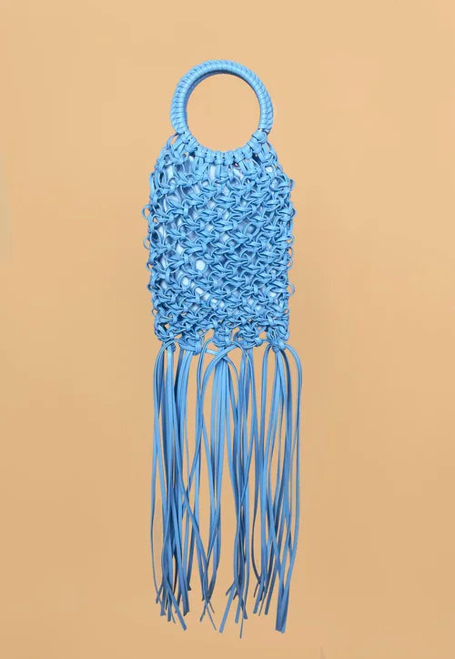 Hand crocheted 100% rescued Italian leather with matching silk lining and hand wrapped handle. Fringe measures 40 cm long when shipped but can be cut to your preferred length with scissors. Magnetic closure. 100% handmade in Italy